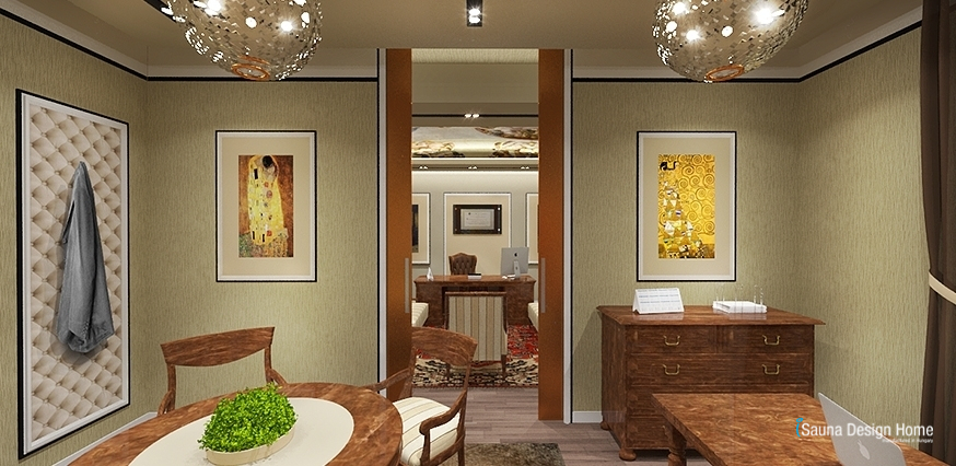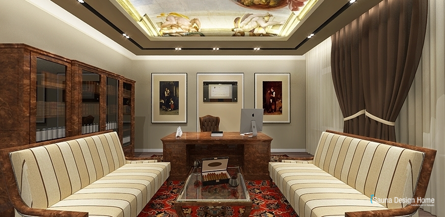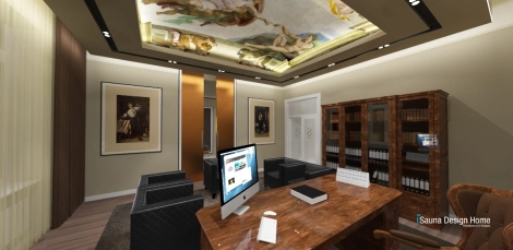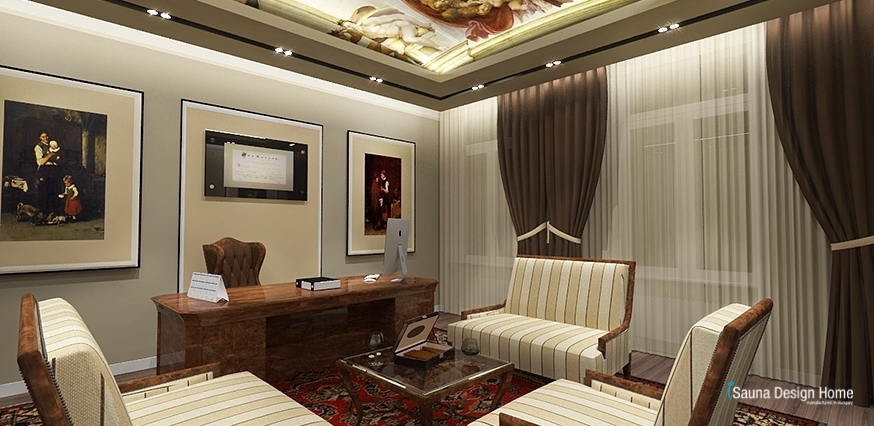Zde jsou prošívané obklady béžové barvy, kulaté křišťálové lustry. Ve faloštnom stropě zapuštěné moderní osvětlení zajišťuje vhodné osvětlení k práci. V místnosti se nachází jeden psací a kulatý stůl v klasickém stylu.