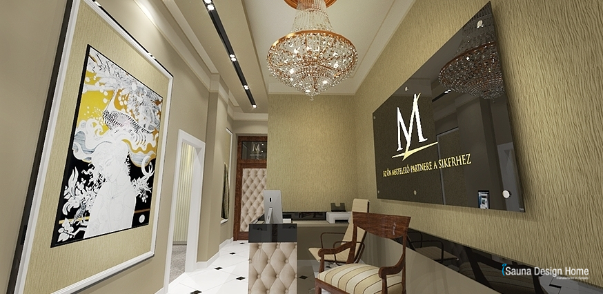 Eleganci recepce jsme museli přizpůsobit již stávající obkladu ve stylu art deco. Během interiérového designu jsme museli vycházet a sladit všechno odsud. Erb podnikání je zvýrazněním umístěný v hale, kde zvyšuje elegantnost jeden reprezentativní křišťálový lustr. Pult pro sekretářku byl vybudován šetrně na místo a takto zůstalo místo i pro vytvoření malé čekárny pro klienty.